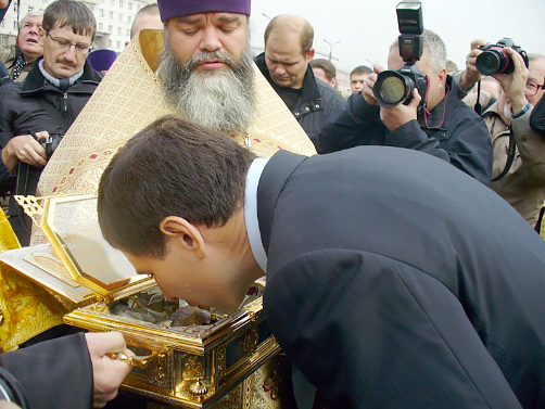 Недопустимо прикладываться к святыне с накрашенными губами. Перед прикладыванием необходимо сделать два поясных поклона, крестясь при этом, а после, крестясь, ещё один поясной поклон.