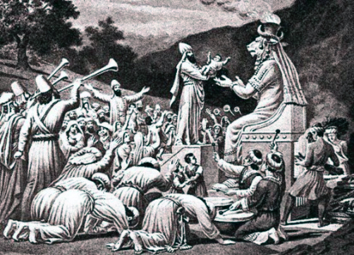 Каким же был этот бог Молох, или «Удача», как мы его называем сегодня? Его статую, отлитую из меди или серебра, возили на двухколёсной тележке. Со спины у него была медная печь, а перед ним — медная сковородка; сзади в Удачу подбрасывали дрова, пока не раскалится изваяние. А жрецы его несли в руках секиры, большие и отточенные.