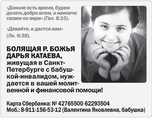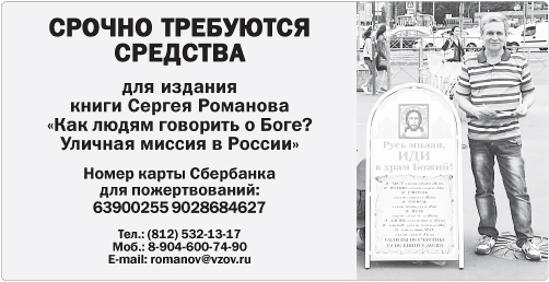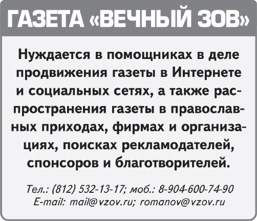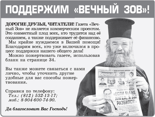 ГАЗЕТА «ВЕЧНЫЙ ЗОВ» СЕРДЕЧНО БЛАГОДАРИТ всех читателей, при финансовой поддержке которых вышел этот номер. Просим ваших молитв за Г. М. Погосяна, А. А. Скорова, М. С. Демиденко, С. В. Захарова, А. А. Мясоедова, Л. С. Моложаеву, А. Б. Красикова, С. А. Трусова, В. Я. Косареву, протоиерея Григория Григорьева, О. В. Юдину, евангельскую группу Е. Г. Шваркуновой, Л. А. Лупашку, иеродиакона Никона (Муртазова), И. А. Мигунову, З. В. Томашевскую, Г. В. Куратова, Т. Д. Эрзрумян, С. В. Тимофеева, Е. Н. Абрамову, Е. К. Палибина, М. И. Столярова, Э. В. Мерту, С. Е. Полуэктова, Э. Э. Ашкрумову, М. Г. Богдадьеву, Роланда и Трауте Бенц, И. Л. Бахвалову, Н. М. Сорокину, В. В. Лысенко, К. В. Леншину, семью Зайцевых, Э. Я. Чиковани, А. Г. Боженко, А. А. Шенгелидзе, Е. В. Колосову, Л. А. Калинину, А. И. Фёдорову и других читателей, друзей и благотворителей, внёсших в создание и выпуск этого номера свою важную лепту.