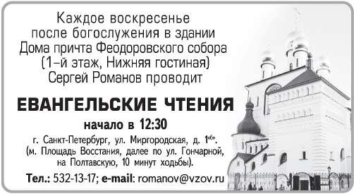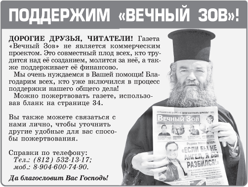 ГАЗЕТА «ВЕЧНЫЙ ЗОВ» СЕРДЕЧНО БЛАГОДАРИТ всех читателей, при финансовой поддержке которых вышел этот номер. Просим ваших молитв за Г. М. Погосяна, А. А. Скорова, А. А. Мясоедова, Э. В. Мерта, Л. С. Моложаеву, С. В. Захарова, А. Б. Красикова, С. И. Троицкую, И. Л. Бахвалову, М. Г. Богдадьеву, иеродиакона Никона, В. Г. Бойкову, Роланда и Трауте Бенц, Т. Д. Эрзрумян, Ю. Л. Савина, Э. Э. Ашкрумову, Т. В. Савиных, А. Г. Боженко, А. А. Шенгелидзе, Е. В. Колосову, Н. П. Жданова, семью Зайцевых, И. В. Климину, евангельскую группу Фёодоровского собора, Е. В. Терешину, И. А. Мигунову, З. В. Томашевскую, И. К. Цимбалюк, М. Н. Потапову, В. Я. Колмык, М. Л. Шприц, Л. А. Лупашку, А. Л. Картинину, Г. К. Берёзкину, В. В. Лысенко, С. В. Тимофееву, И. С. Котова, С. Е. Полуэктова, Ж. А. Камышеву и других читателей, друзей и благотворителей, внёсших в создание и выпуск этого номера свою важную лепту.